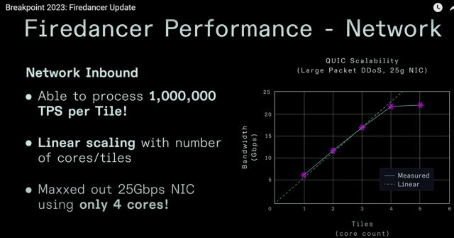 特筆すべきは、システムの性能がハードウェアリソースの増加とともに線形に拡張可能となっており、Firedancerが数百万トランザクションの処理能力を持つことが期待されている。また、同時にFPGA(Field-Programmable Gate Array)やGPUの活用による高速化の取り組みが進められており、あるテストでは1秒間に800万トランザクションを記録したという。