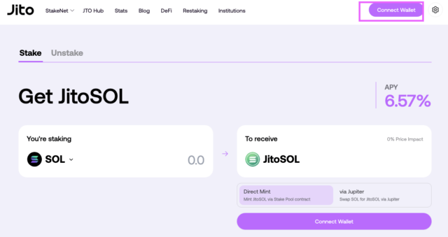 SOLをウォレットに送金できたら、次はJitoの公式サイトでJitoSOLを取得します。