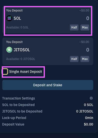 「Single Asset Deposit」のチェックを外し、預け入れるSOLの数量を入力(自動でJitoSOLの数量が入力される)→「Deposit and Stake」をクリックします。手数料などを確認し、ウォレットでトランザクションを承認します。