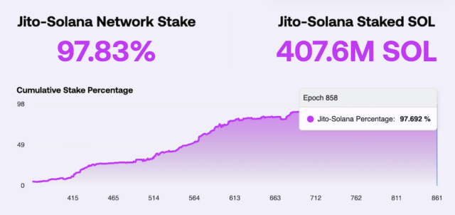 加えて、Jitoが提供するバリデータ向けソフトウェア「Jito-Solanaクライアント」の普及も重要です。このクライアントはMEV(最大抽出可能価値)を効率的に抽出・再分配する仕組みを備えており、バリデータの収益を平均20%向上させています。その結果、約1,800のアクティブバリデータのうち90%以上が採用し、ステークウェイトベースでも88%を占めています。