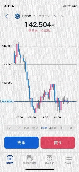 「販売所」では一般的に、購入価格と売却価格の間に「スプレッド」と呼ばれる価格差が設けられています。USDCの場合、計測時点ではおよそ0.5円のスプレッドがあり、取引価格(例:142円)に対して約0.352%に相当します。なお、このスプレッドは市場の流動性や価格変動に応じて変化する可能性があります。
