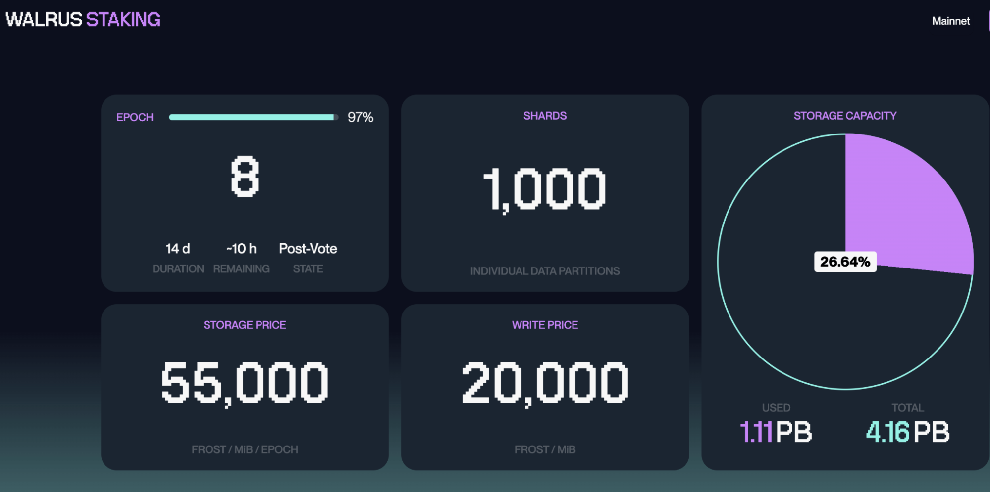 データ保存ユーザーがWALトークンで料金を前払いし、その料金が約2週間のエポックに分散して配分され、ストレージノード運営者とステーカーに報酬として分配されます。WALトークンをストレージノードに委任することで参加でき、ステーク量に応じてノードが担当するデータ量が決定され、担当データ量に比例して報酬が増加します。