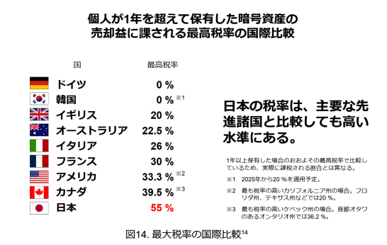 現在、暗号資産取引の利益は「雑所得」として総合課税の対象となり、最大55%(所得税45% + 住民税10%)の税率が適用される。加えて損失繰越控除も認められておらず、株式やFXなどの他の金融商品と比較して不利な税制となっている。