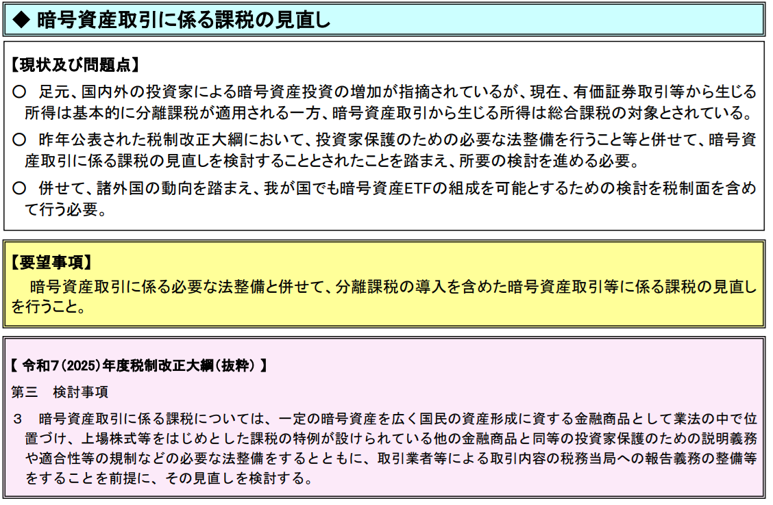 業界団体(JCBA・JVCEA)は、現物もETFと同様に分離課税の対象とするよう要望しています。ETFのみ20%・現物55%のままでは課税の公平性を欠くため、制度設計の主要論点です。