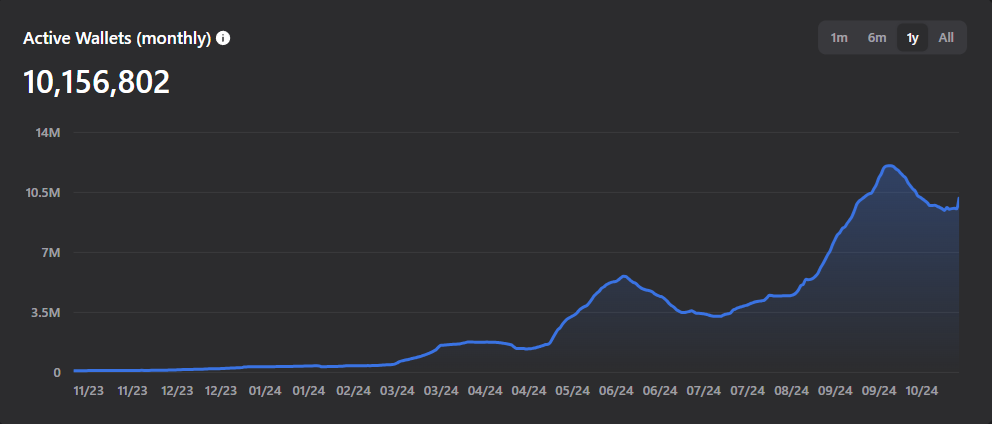 「タップ・トゥ・アーン」は2024年に急成長しており、これに伴いトンコインのユーザー数も急増しました。月間アクティブ・ウォレット数は、2023年末の10万未満から2024年6月時点で540万以上、同年9月末には1000万件に増加しました。