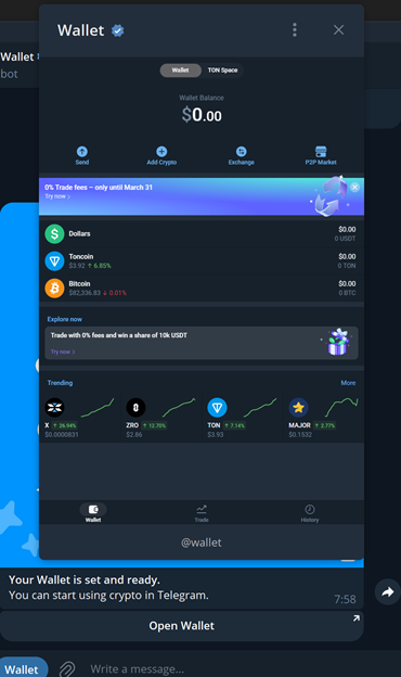 Telegram Wallet(@wallet / Ton Space)は、Telegram上の公式ウォレットBot「@wallet」を介して、簡単かつ高速にトンコインの送受金ができる仕組みです。 カストディ型(ウォレット管理を@wallet側に任せる)とセルフカストディ型(秘密鍵をユーザーが管理するTon Space)を切り替え可能な点が特徴で、Telegramユーザー同士なら手数料無料で送受金できるメリットがあります。