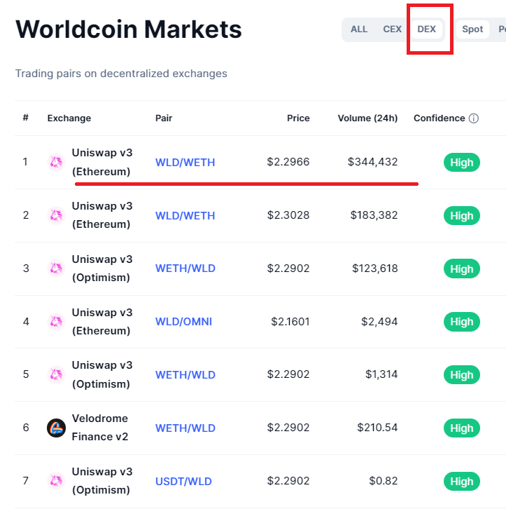 ③流動性データの確認: 各DEXの24時間の取引量を見ると、ユニスワップ(Uniswap)というDEXの、「WLD/WETH」ペアで1日に34万ドルの出来高が生まれています。※WETHはDEX用にERC20規格に変換されたイーサリアム(ETH)のこと、ユーザーとしてはETHを取引する際に、背後で自動的に変換されます。
