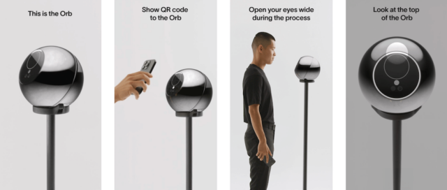 2.アイリススキャン:専用デバイス(Orb)を介してアイリススキャン(個人の虹彩を読み取って識別する生体認証技術)を受け、固有のWorld IDを取得します。