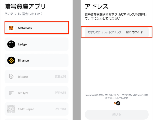 2.Metamaskを選択し、自身のMetamaskアドレスを入力し、送金を完了してください。(安全のため、少額のテスト送金を行うことを推奨します)