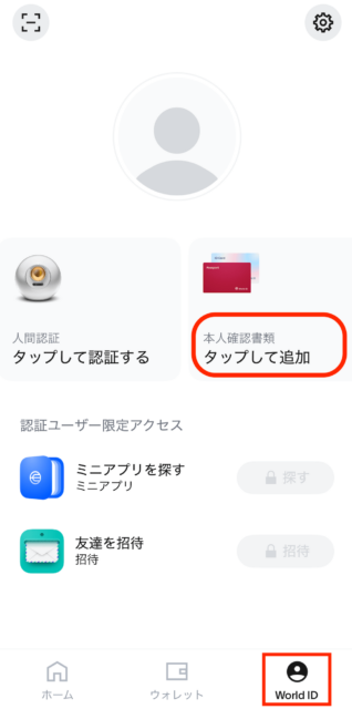 World IDのページでは、虹彩認証の状況や本人確認書類の認証状況を確認できます。本人確認書類をタップしてください。また、ORBでの認証方法は、ワールドコインのもらい方を確認してください。