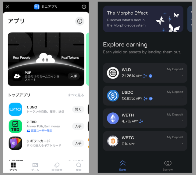 World Appにはミニアプリという機能が搭載されており、このアプリを通じてWorldコインの運用が可能です。例えば、レンディングプロトコルのMorphoでは、ORB認証していると利回りが増加する仕組みがあり、20%以上の利回り(2025年11月現在)が期待できます。