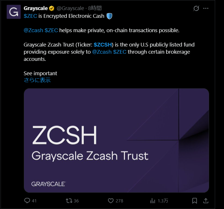 また、ジーキャッシュのファンド「グレースケール・ジーキャッシュ・トラスト(ZCSH)」を提供するグレースケールが、頻繁にプロモーションを行なっていることも最近の出来事として関心を集めています。