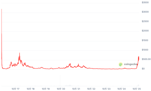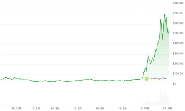 注目度の高さは価格にも現れていて、9月の終わりは66ドル付近で推移していましたが、11月には720ドル超まで上昇しました。この期間の上昇率は990%超です。