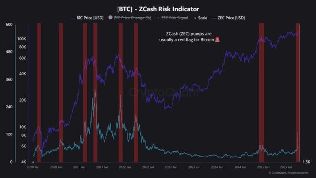 クリプトクアントのコミュニティアナリストMaartunn氏は2025年10月、ジーキャッシュの高騰は通例ビットコインにとって警戒のサインであるとの分析を公開しました。