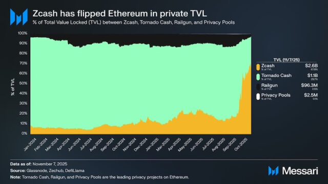 メッサリの2025年11月7日時点のデータによると、2024年1月1日時点でジーキャッシュのシールド(匿名化)総額は3,470万ドルだったのに対し、イーサリアムのプライバシープロトコルの総預かり資産(TVL)は約3.6億ドルでした。