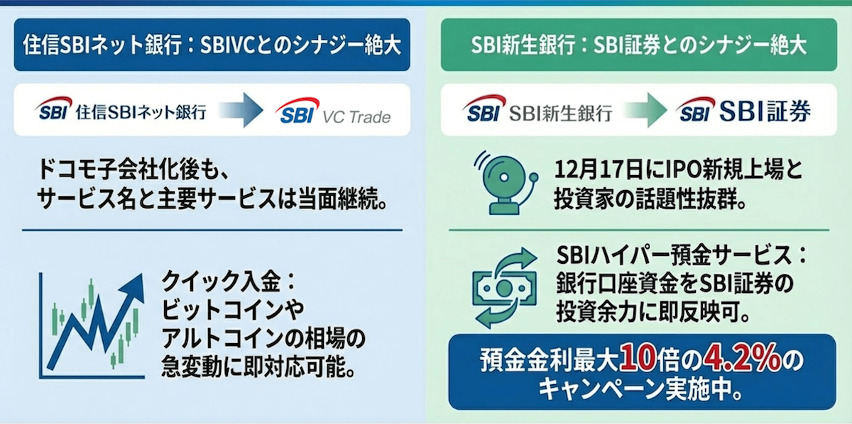 SBIグループの強みは、各サービスが単独ではなく連携して機能する点にあります。仮想通貨取引と銀行・証券を組み合わせることで、資金効率と投資機会の両面で大きなメリットが得られます。