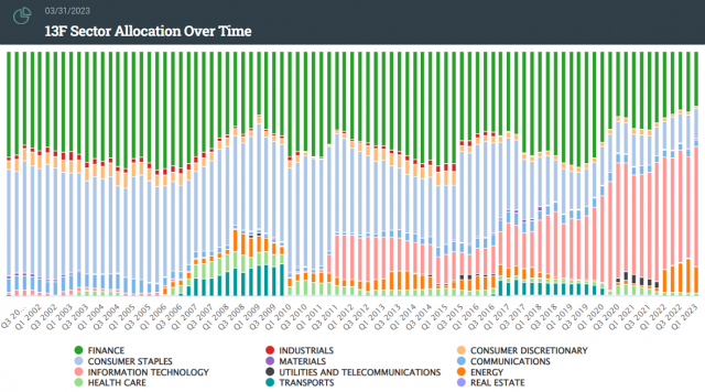 バークシャー・ハサウェイのセクター別比重の推移 出典:whalewisdom