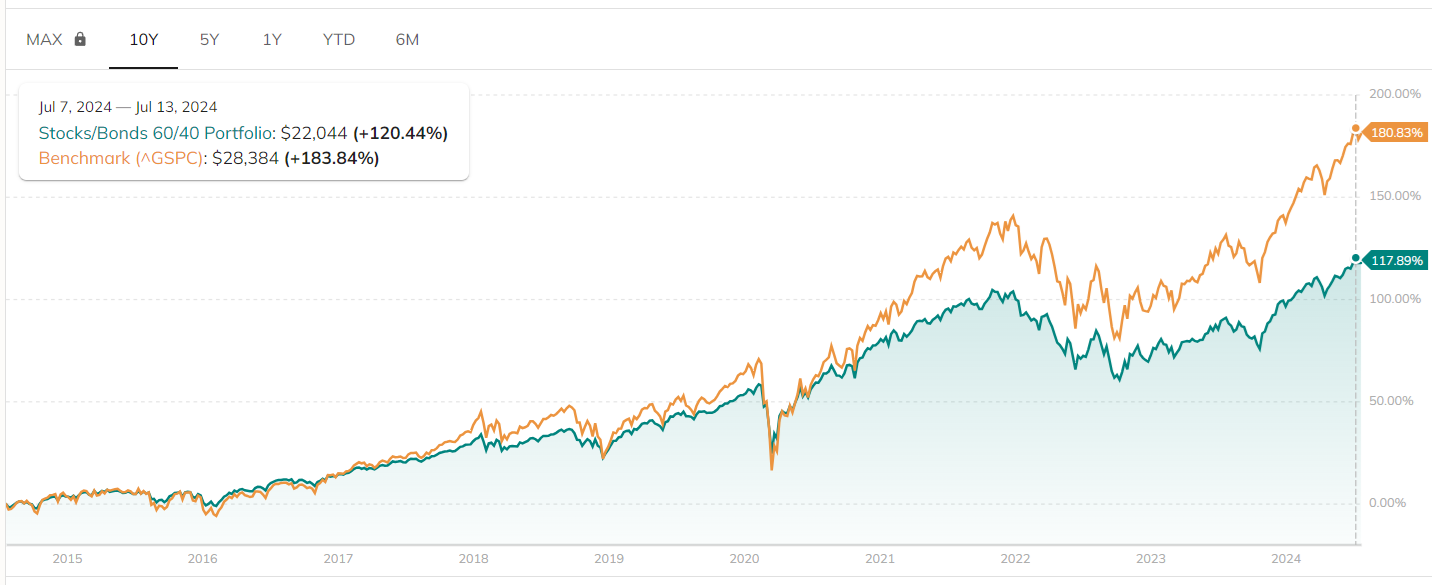 株式/債券 60/40 ポートフォリオにおける 10,000 ドルの初期投資資金の成長チャート 出典:PortfoliosLab