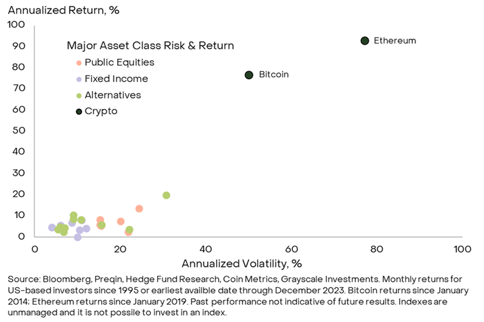 暗号資産は、ハイリスク・ハイリターンの可能性を秘めた投資です。例えば、ビットコインの年率リターンは約50%、年率ボラティリティは約75%です。イーサリアムも同様に高いリスク・リターンの特性を持っています。