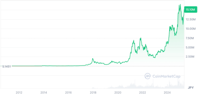 暗号資産(仮想通貨)ビットコイン(BTC)の価格は、2025年5月時点で約1,560万円まで上昇しています。2017年12月の仮想通貨バブルの最高値200万円と比較しても、約7.8倍になったことになります。