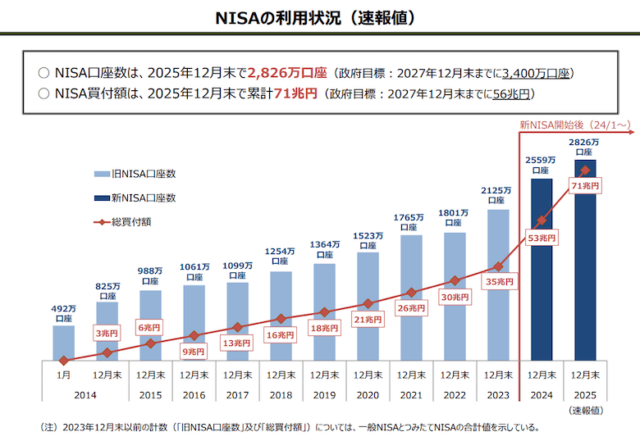 新NISA(少額投資非課税制度)の制度が始まって、2026年で3年目に入りました。以下の金融庁のデータによるとNISA買付額は2025年12月末時点で累計71兆円に上り、「2027年12月末までに56兆円到達」という政府目標を前倒しでクリアしていて、需要の高さを示唆しています。