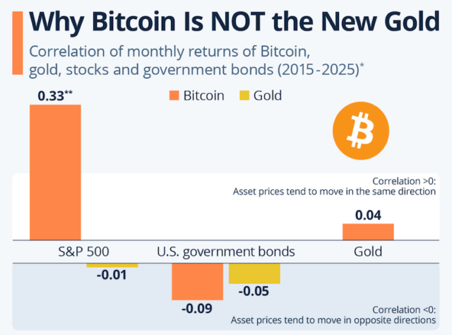 また、値動きについては、以下のようなデータが参考になります。この画像は、ビットコインと他の資産との相関性を表したデータ。このグラフはDIW Berlinのデータを活用してStatistaが公開しており、ビットコイン、金、S&P500(株価指数)、米国債の2015年から2025年における月次リターンの相関性を示しています。