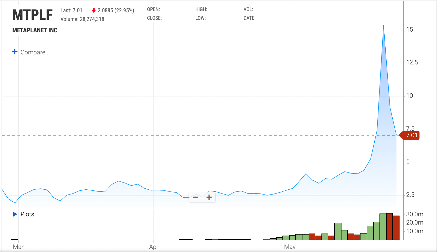 2025年5月1日には、米国市場での認知度向上を目指し、フロリダ州マイアミに子会社「Metaplanet Treasury Corp.」を設立。The Blockの報じたところによれば、大型の資金調達を行いビットコイン購入を加速する計画だ。このような動きが米国投資家の関心を引き、ドルプラの取引が活発化したと見られる。