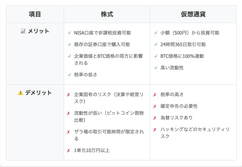 一方、税制優遇と取引の簡便性を重視し、企業特有のリスクを受け入れられる投資家にとって、メタプラネットやリミックスポイントなどの仮想通貨関連株は現実的な代替手段となり得る。