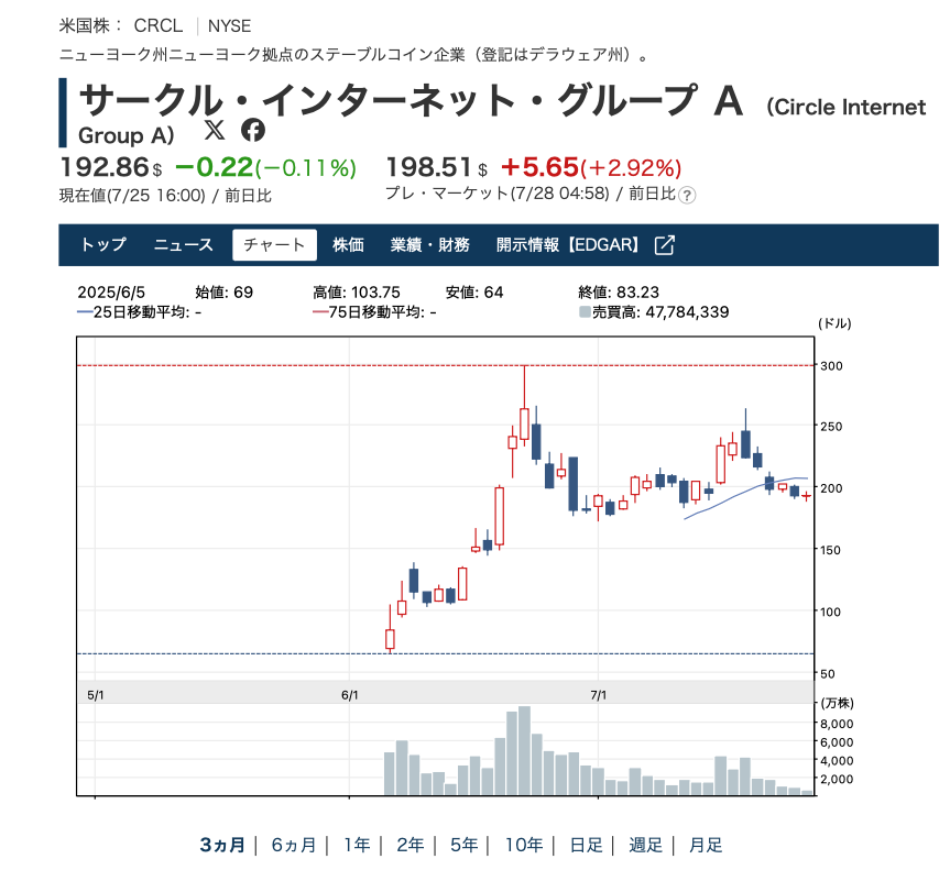 サークル株は2025年7月のIPO直後、申し込み倍率25倍超という人気を集め、初値は83ドルと急騰。「コインベースIPOの再来」とも言われ、FOMO(取り残される恐怖)に駆られた個人投資家の買いが集中した。