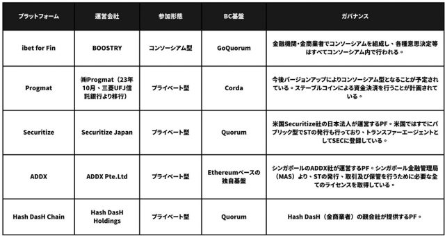 国内STプラットフォームには、三菱UFJ信託銀行、みずほ信託銀行、三井住友信託銀行といった大手金融機関が資本参加するProgmat(プログマ)や、株式会社BOOSTRYが主導する共有基盤「ibet for fin」等があります。
