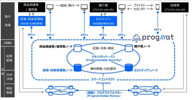ST基盤となるブロックチェーンは金融機関が接続するシェアド(共有)プラットフォームとして機能します。その特性から、制限されたノードが管理し、特定のユーザーのみがアクセスできるパーミッション型が使用されています。