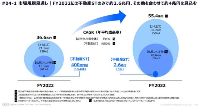 市場規模の見通しにおいて、2032年度には不動産STの市場が大きく伸びることが予想されます。2022年度(22年4月1日~23年3月31日)の不動産STの市場規模は400億円超で、これはJ-REITや私募ファンド等との合計の1%未満ですが、2032年度にはその規模が2.6兆円となり、同合計の5%を占めることが見込まれます。