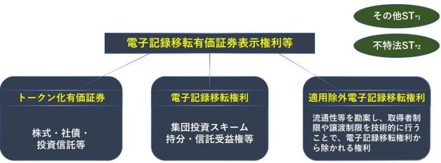 電子記録移転有価証券表示権利等には3つのカテゴリが含まれ、法律上は以下の2つに整理されます: